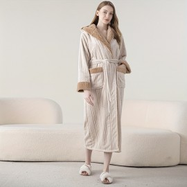 1pc Autumn And Winter Bathrobe, Soft Unisex Pajamas, Thickened Large Size Nightgown, Long Sleeves Bathrobe With Pocket, Warm Long Robe For Home, Bathroom Supplies